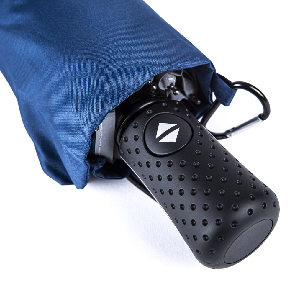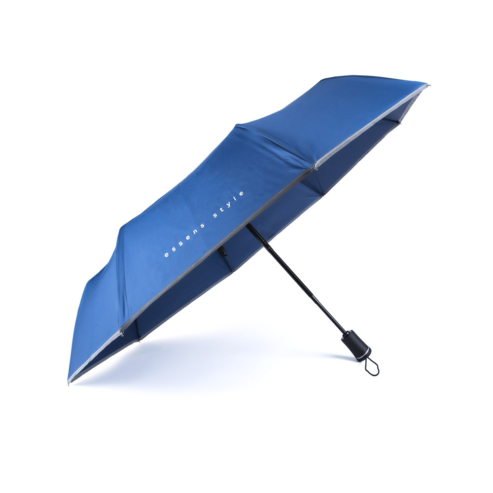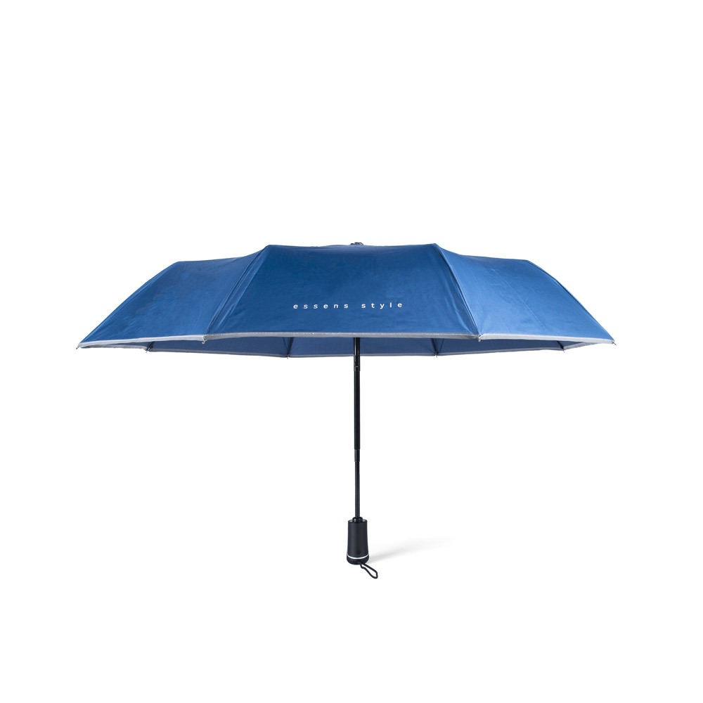 Mechanický skladací dáždnik v modrej farbe s ESSENS logom. Dáždnik zdobí strieborné reflexné lemovanie a je zabalený v ochrannom látkovom púzdre.