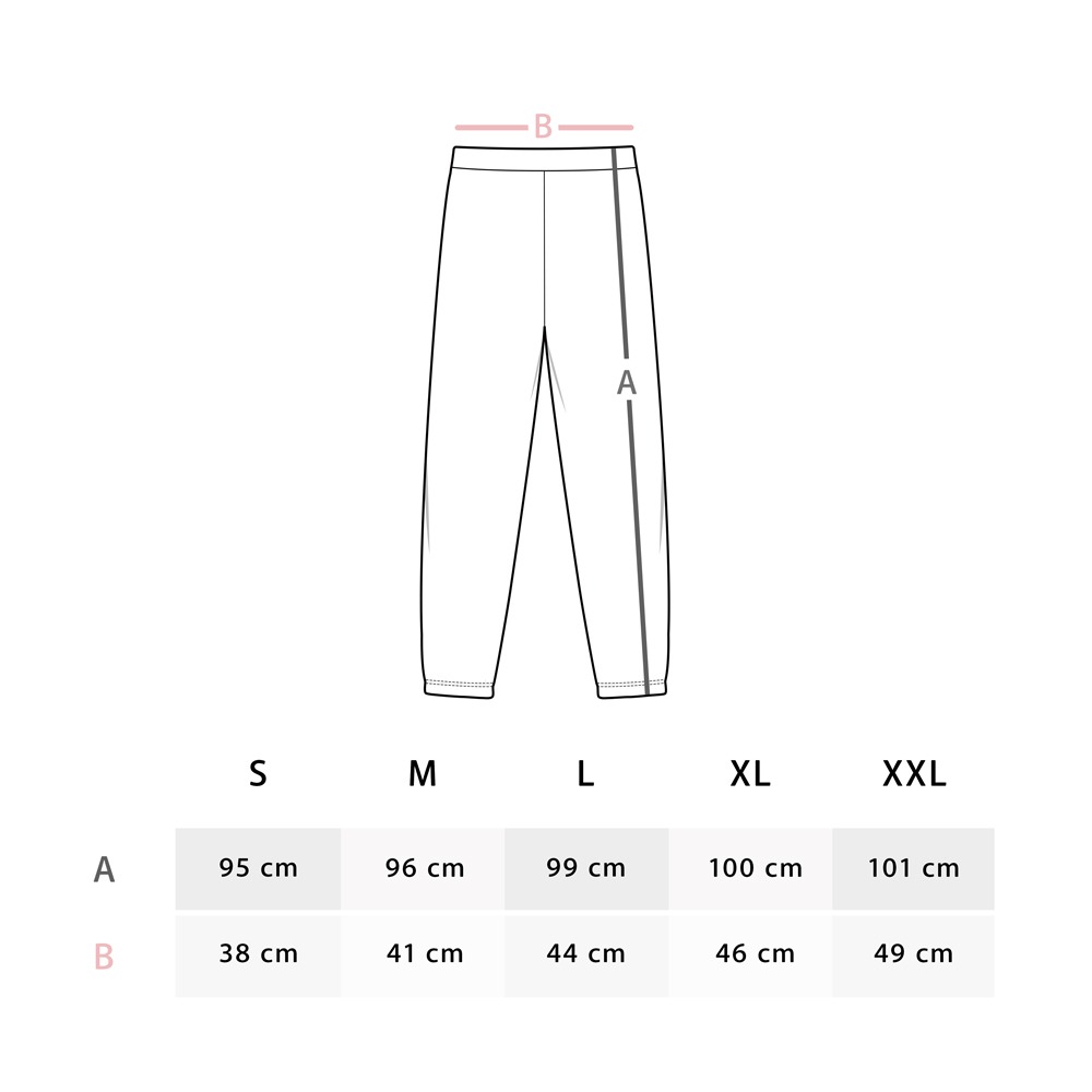 Strih: dlhé nohavice, dve bočné vrecká, elastický pás so šnúrkou, manžety nohavíc z rebrovaného úpletu