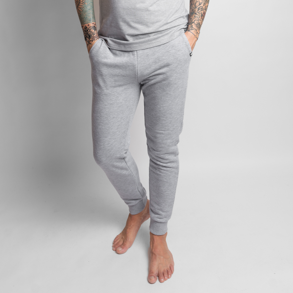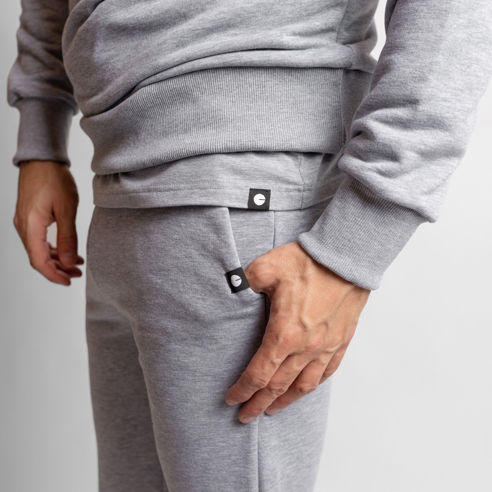 Šedé pánske tepláky v klasickom rovnom strihu s originálnym dizajnovým štítkom písmena "E" umiestneným na bočnom vrecku.