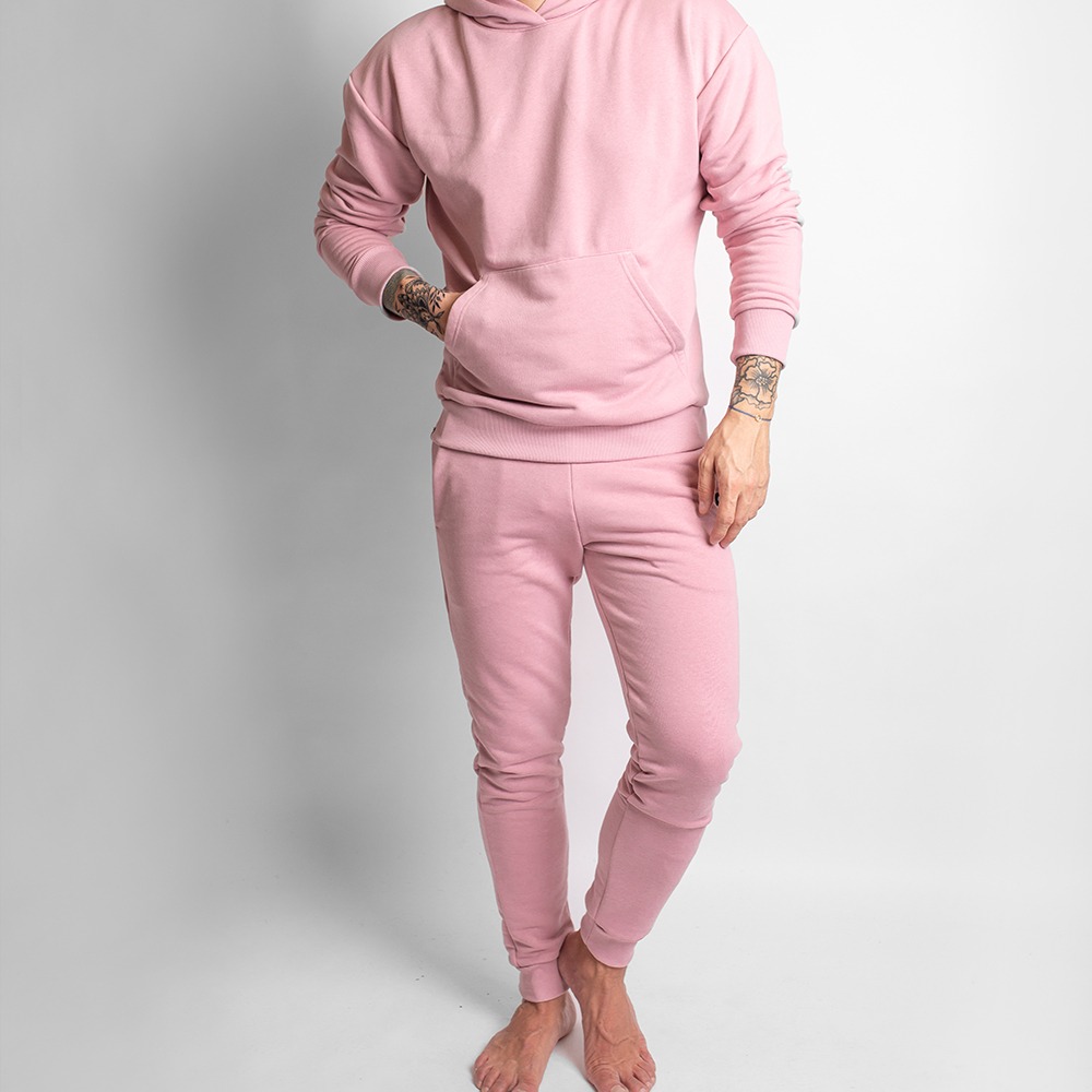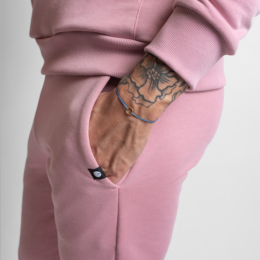 Ružové unisex tepláky v klasickom rovnom strihu s originálnym dizajnovým štítkom písmena "E" umiestneným na bočnom vrecku.